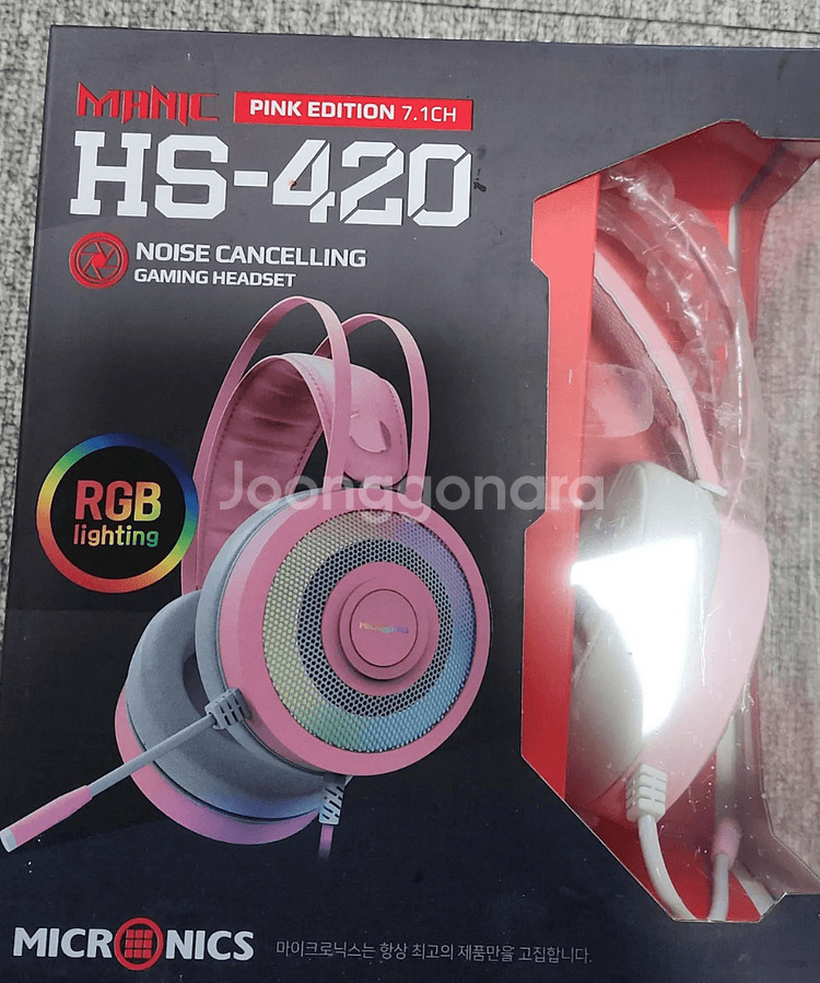 핑크 에디션 노이즈캔슬링 게이밍 헤드셋이에요. RGB 조명 기능이 있어서 게임할 때 분위기 좋고, 박스만 개봉해본 상태로 보관되어 있는 새 제품입니다.