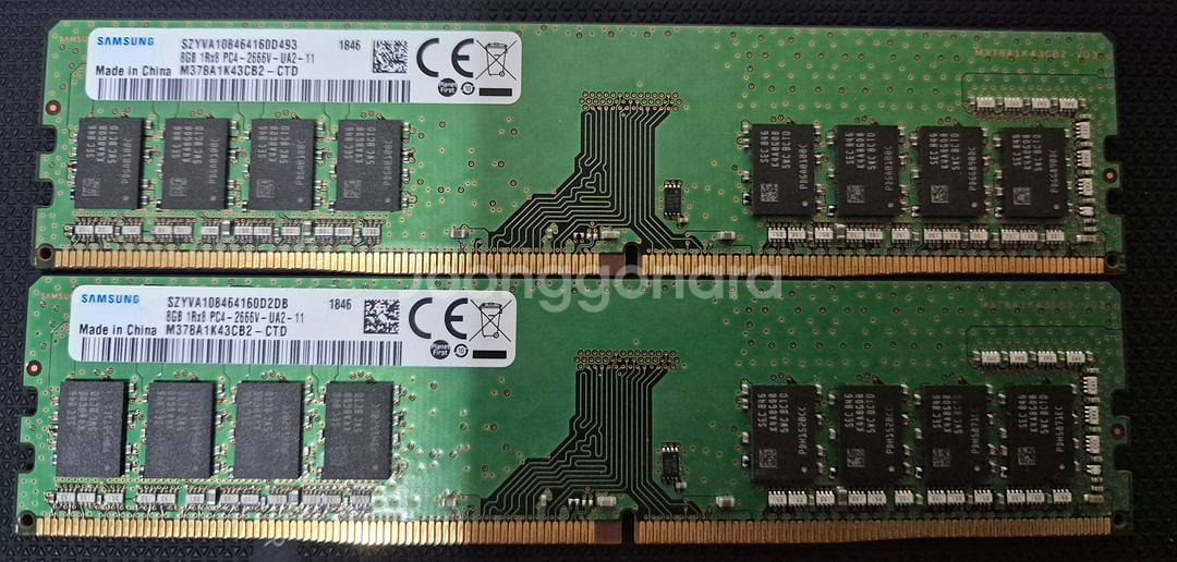 제조사 삼성전자 (Samsung) 제품군 DDR4 SDRAM (PC4) 데스크탑용 (UDIMM) 용량 8GB (개당) 총 16GB 구성 동작 속도 2666MHz (PC4-21300) 라벨의 2666V 확인 램 타이밍 CL19-19-19 표준 규격 (JEDEC) 전압 1.20V 저전력 표준 구성 1Rx8 (Single Rank) 단면 8칩 구성 제조 주차 1846 (2018년 46주차) 11월 중순 생산분 오버클럭 없이 사용하다 32GB로 업그레이드하기 위해 탈거한 A급 C다이 중고램입니다. 정전기방지 비닐에 포장하여 택배발송합니다.