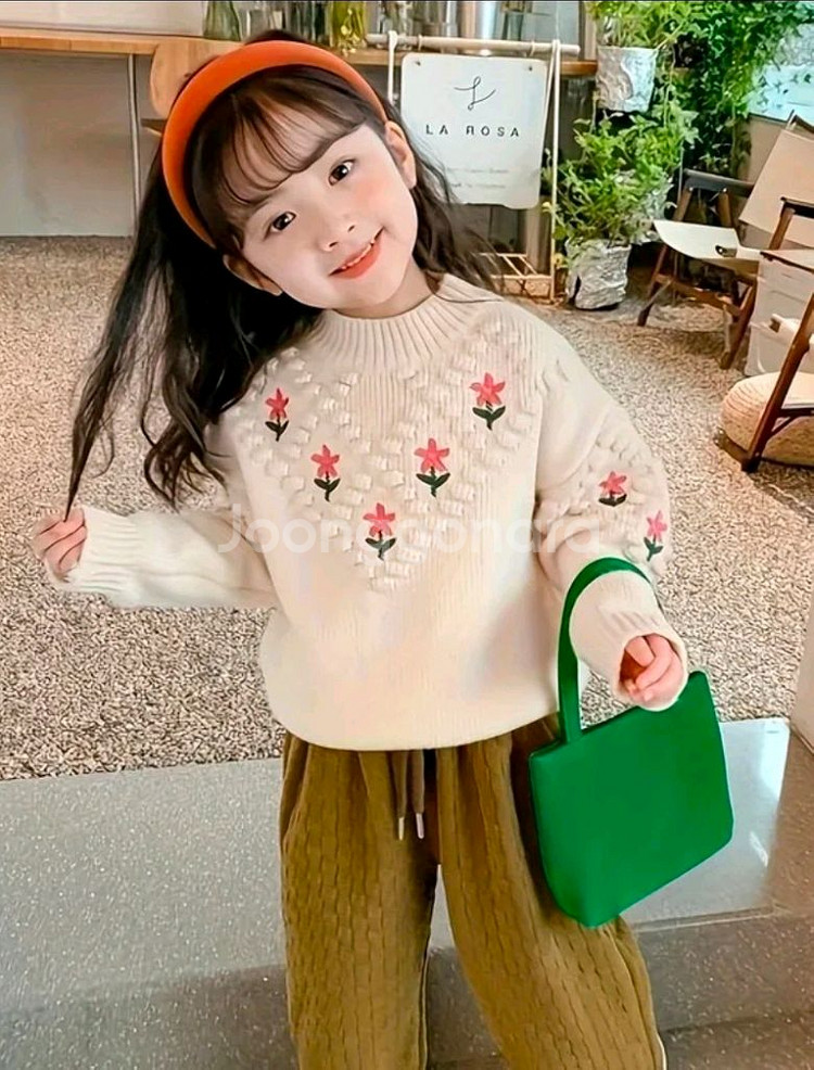 귀여운 꽃 자수가 포인트인 여아용 니트예요. 아이보리 색상이며 새제품입니다. 150사이즈 가슴둘레 단면 43cm 기장 51cm 반품.환불 안되세요.