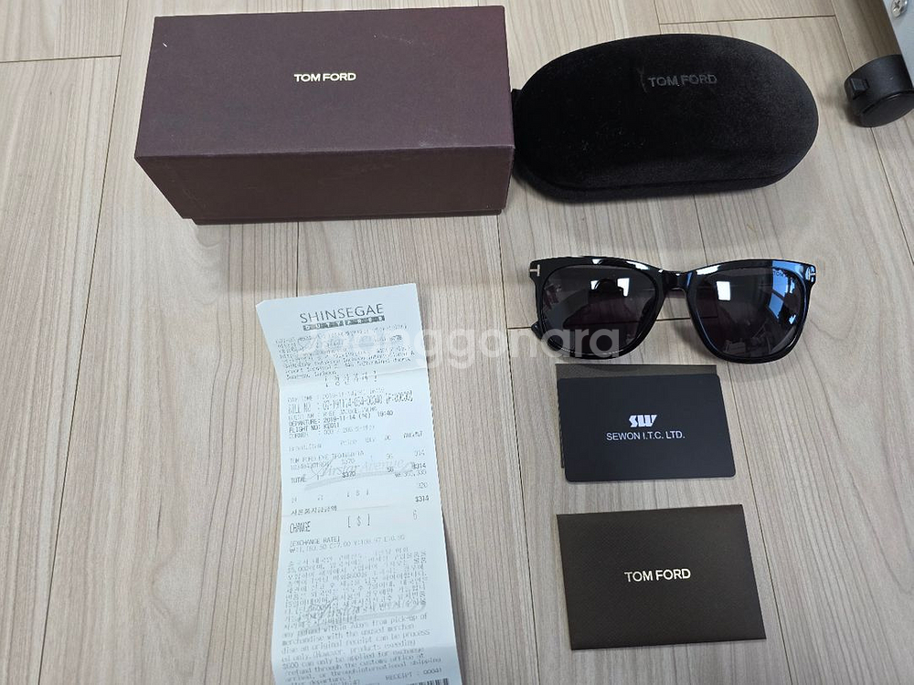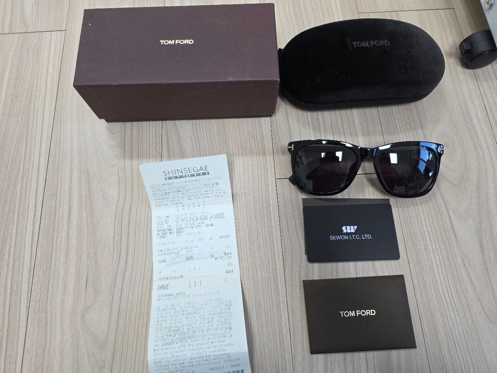 톰보드 정품 선글라스로 박스, 케이스, 영수증 등 구성품이 모두 포함되어 있어요. 상태 양호하고 깔끔한 블랙 프레임이 세련된 느낌을 줍니다. 19년도에 선물받고 보관만 해뒀던 제품입니다.