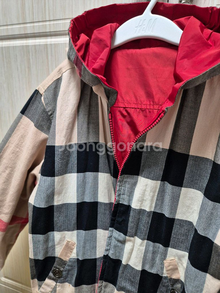 버버리 체크 패턴과 레드 컬러의 리버시블 후드 바람막이 자켓 10y 140cm예요~ 7-9세 잘 맞을듯 해요/