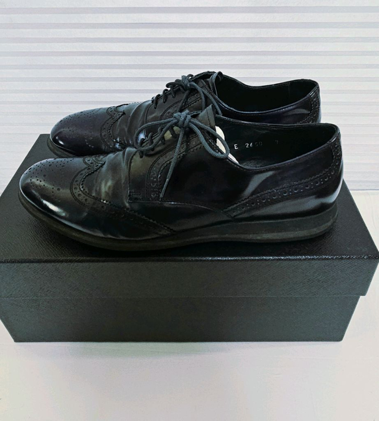 PRADA프라다 윙팁 남성 옥스포드구두 사이즈 260(7사이즈) 에나멜소재의 옥스포드구두로 사용감 많지않으며 젊은분에게 잘 어울립니다 다크네이비톤 8.5~9/10컨디션