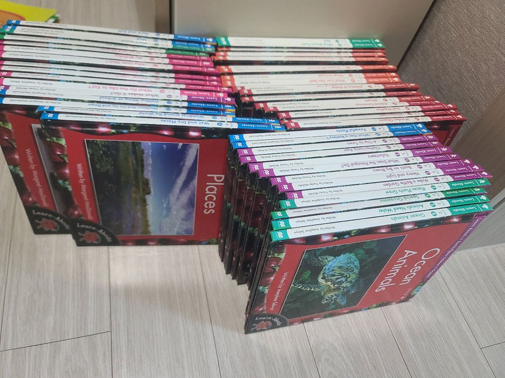 아이들 영어 학습용 교재 전집이에요. Ocean Animals 등 다양한 주제의 책들이 포함되어 있고, 사용감은 있지만 읽기에는 문제없는 상태입니다. 워크북도 포함되어있어요