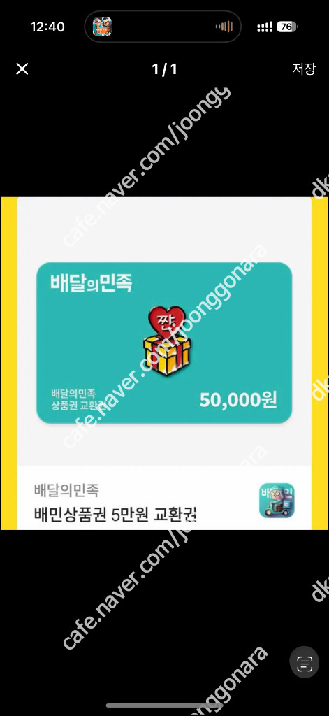 개인정보(거래정보)를 주고받는 행위는 사기에 노출될 수 있으므로 즉시 중고나라로 신고해 주세요배달앱에서 사용 가능한 5만원 상품권이에요. 배달 주문할 때 현금처럼 사용하실 수 있습니다.