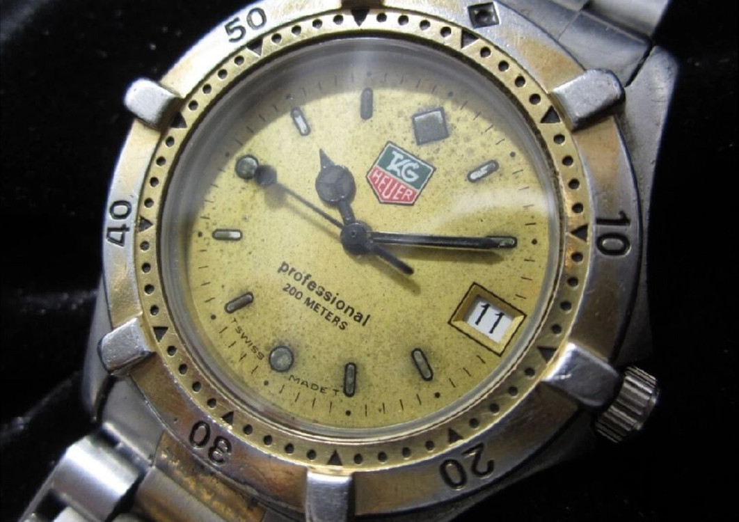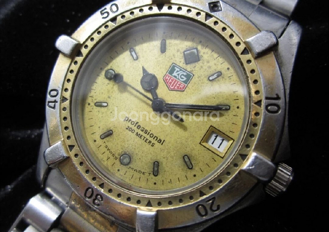 태그호이어(TAG Heuer) 프로페셔널 다이버 워치 판매합니다. 현재 정상 가동 중인 가동품이며 최근 건전지 교체 완료되어 바로 사용 가능합니다. 회전 베젤 정상 작동하고 크라운 및 날짜 변경 문제없습니다. 케이스 사이즈 약 37mm, 팔목둘레 약 16cm 기준이며 태그호이어 순정 콤비 브레이슬릿과 버클 장착되어 있습니다. 다이얼은 빈티지 특유의 에이징(변색·점박이) 존재하며 유리 및 케이스에 사용감과 스크래치 있습니다.