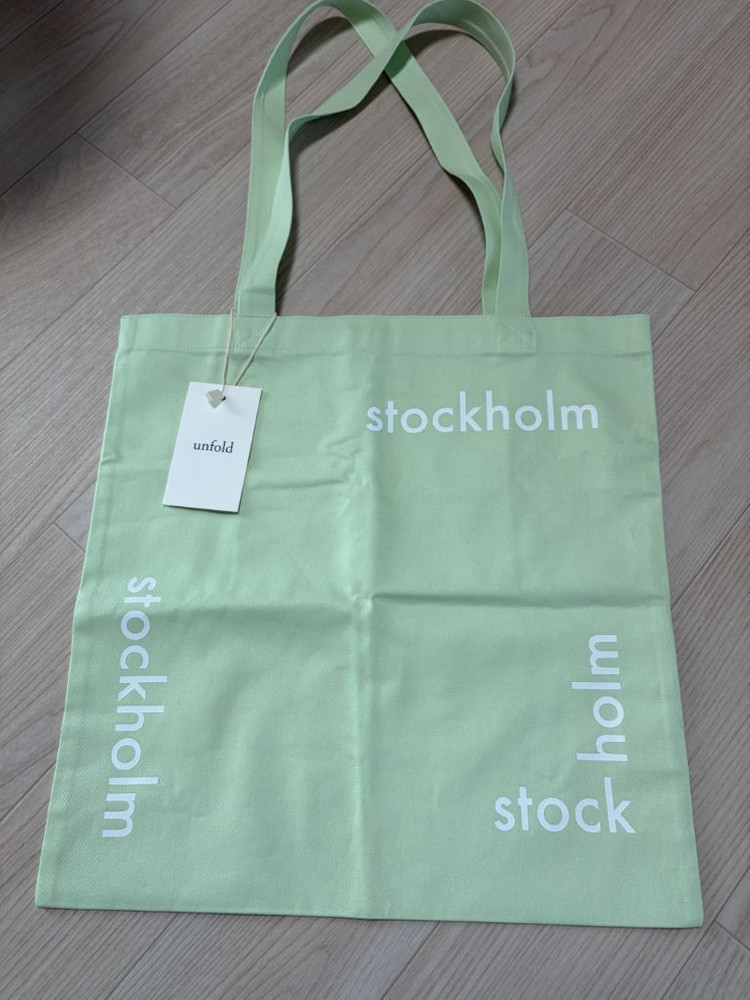 택 달린 언폴드 스톡홀름 에코백 민트 새상품입니다. 산뜻한 민트 색상에 stockholm 레터링이 포인트로 들어가 있습니다. 데일리백으로 가볍게 들고 다니기 좋아요.