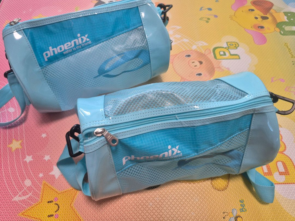 학교 생존 수영때 1번 쓰고 보관해뒀어요 안에 옷 넣을때 봉지, 지퍼백으로 다 넣어서 옷 가져 왔고 깨끗해요. 오염 없어요 그 이후에는 손 다쳐서 참관수업만 했어요. 쌍둥이라 일괄 판매만 합니다. 이름 스티커 붙여서 스티커 뗀 자국만 있고 상태 좋아요 빠른 판매 위해 가격 내린거니, 상태는 좋아요. 쿠팡에서 새거 13900원 합니다. 택배시 3천원 추가됩니다.