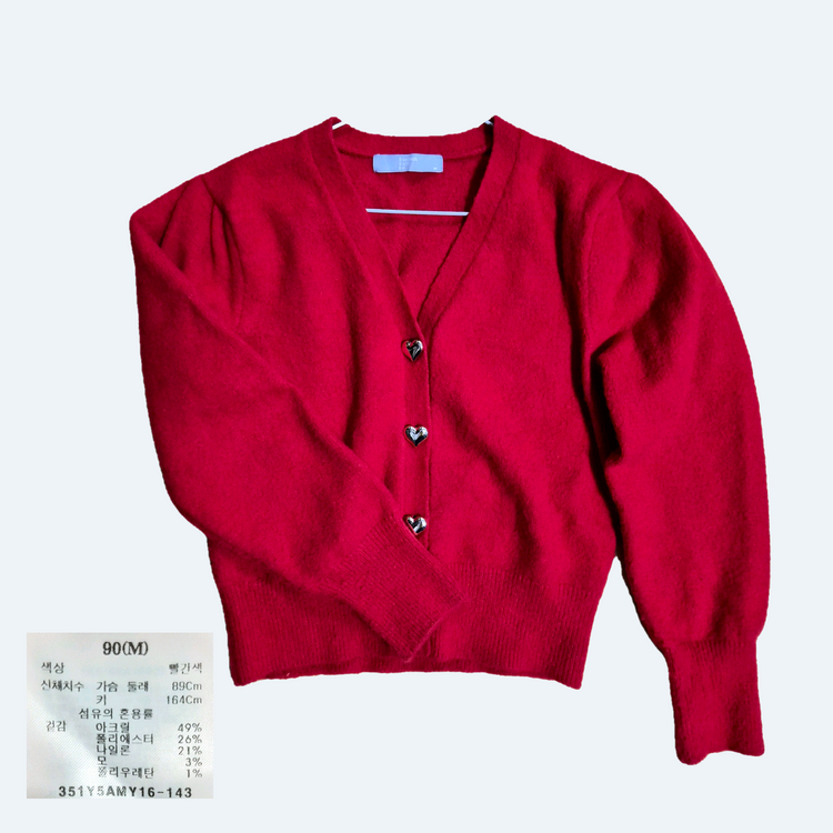 구매 후 실착 1번한 에잇세컨즈 빨간색 가디건입니다 사이즈는 90(M)이고, 소재는 부들부들해서 입었을 때 따갑지 않습니다 단추가 하트 모양으로 되어있어 귀여운 느낌을 줍니다 색상은 마지막 사진에서 좀더 빨강색이 강한 느낌입니다 문의 없으시면 바로 안전결제 해주시면 됩니다!