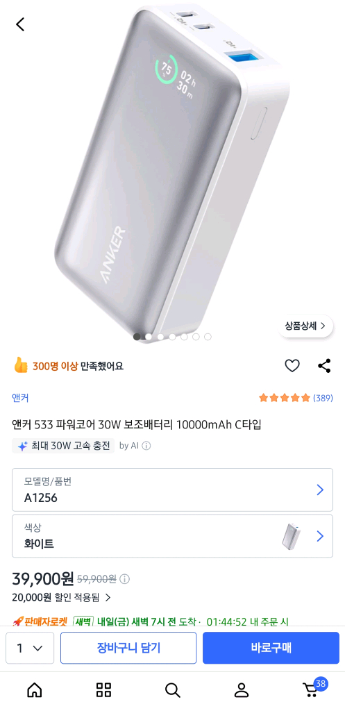 앤커 533 파워코어 30W 보조배터리 10000mAh 용량 고속 충전 지원 배터리 잔량 확인 가능