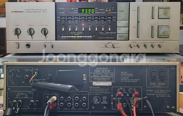 PIONEER(파이오니아) SX-6 리시버입니다. 1980년대 초 일본 파이오니아에서 제작된 스테레오 리시버로 당시 최신 기술이었던 컴퓨터 컨트롤 튜닝 시스템이 적용되어 방송국을 자동으로 탐색하고 주파수를 전자식으로 정밀하게 맞춰주는 첨단 리시버입니다. 아날로그 방식과 달리 주파수 드리프트가 거의 없으며, 원하는 채널을 버튼 하나로 저장·호출할 수 있어 사용 편의성이 뛰어나고 숫자형 디지털 표시창을 통해 주파수를 정확하게 확인할 수 있는 점도 장점입니다. 8Ω 기준 45W + 45W 출력이지만 댐핑팩터가 50으로 스펙과 무관하게 구동력 상당히 좋으며 5Hz–100kHz에 이르는 광대역 주파수 특성을 통해 저역부터 초고역까지 자연스럽고 확장감 있는 사운드를 재생합니다. 총고조파왜율(THD)은 **0.009%**에 불과해 매우 낮은 왜곡율을 가지고 있으며 MM 포노 입력 지원하여 턴테이블도 가능하고 라인 S/N비는 79dB로 노이즈 억제 능력이 뛰어나 깨끗한 음질을 제공합니다. 외관은 80년대 초반기 전형적인 클래식한 디자인으로 레벨미터 움직임도 보기 좋으며 전문가한테 점검 필해 FM 수신감도 좋고 포노단 포함 라인단 이상 없이 작동 잘합니다. 노브 버튼 초록색 산화물이 있는데 잘 안 지워지지만 그 외는 상태 전반적 좋은 편이고 전압은 120볼트 사용합니다. 24만원이며 OIO 963O 968O 가급적 문자로 연락 주시기 바랍니다. Specifications 튜닝 범위: FM, MW 출력 전력: 채널당 45와트(8Ω, 스테레오) 주파수 응답: 5Hz ~ 100kHz 총 고조파 왜곡률: 0.009% 댐픽팩터: 50 입력 감도: 2.5mV(MM), 150mV(라인) 신호 대 잡음비: 79dB(MM) 출력 : 150mV(라인) 크기: 420 x 130 x 370mm 무게: 8.5kg 연도: 1981년