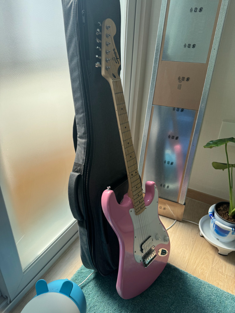 Squier Stratocaster 일렉 기타입니다 색상은 예쁜 핑크색이고, 기타 케이스도 함께 드립니다 상태는 사진에서 보시는 것처럼 양호합니다