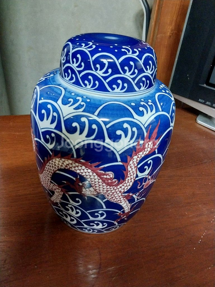 . 파란색 바탕에 물결과 용 패턴이 아름답게 그려져 있고, 뚜껑도 함께 있어서 실용적이에요. 상태 양호합니다