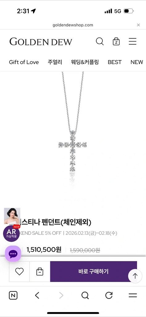 골든듀 크리스티나 펜던트 입니다. 아울렛x 백화점에서만 판매하는 상품이구요! 대전 신세계 백화점 골든듀에서 26.2.9 구입했습니다. 이거랑 고민하던 펜던트가 있었는데 고민끝에 다른걸 구입하게 되어 내놓습니다. 한번 착용하고 보관중이에요!
