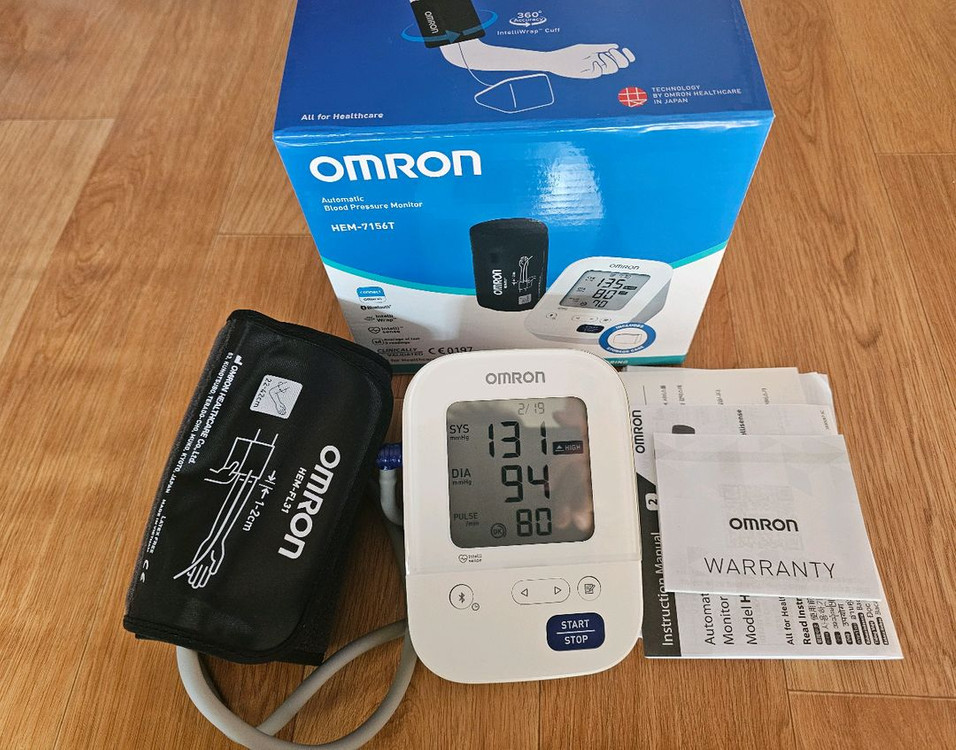 자동전자 혈압계, HEM-7156 블루투스 기능있어서 휴대폰하고 연동됩니다 디지털 혈압계 세트입니다. 박스, 설명서, 구성품이 모두 포함되어 있고 상태 양호해요. 정확한 혈압 측정이 가능한 제품입니다.
