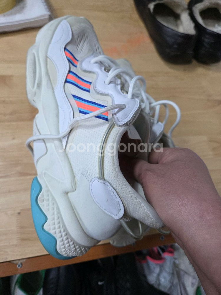아디다스 오즈위고 화이트 오렌지/블루 265사이즈입니다. 밑창에 포인트로 들어간 하늘색이 예뻐요. 실착 횟수 많지 않아 상태 좋습니다