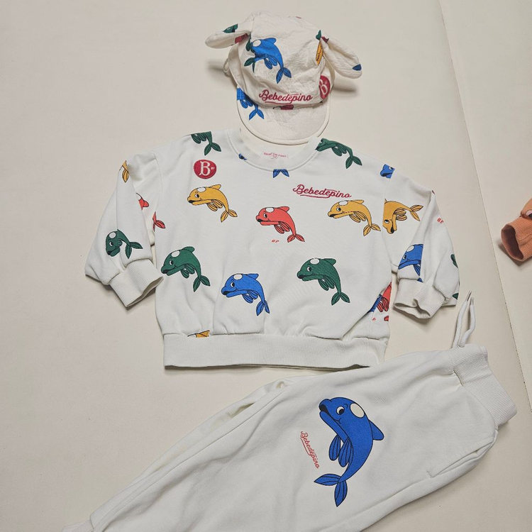 귀여운 돌고래 패턴의 베베드피노 티셔츠100 사이즈와 모자 판매합니다 너무 귀엽고 내복안에 입혀도 좋아요 *원하시면 바지도 드립니다 -흰색이라 얼룩이 많음(덤이라 생각하시고 편하게 입히실분 연락주세요)-반값택포