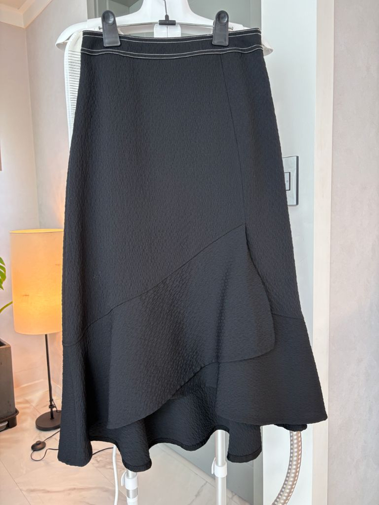 사용감 거의 안느껴지고 스티치 장식이라 고급져요. 엠보 원단과 입체적인 재단이 특징인 스커트로 아래 여러겹으로 덧대 움직이실 때 마다 살랑거리는 느낌이 너무 이쁘고아래 부츠랑 입으심 너무 이쁜 기장의 스커트에요. 아끼다 옷장에 보관해두었다가 스커트가 이제는 손이 안가서 올려봅니다. 날이 추워지면 어두운 컬러에 이런 디테일 많이 들어간게 세련되보여 이쁘더라구요. 한겨울 제외 입기 좋아요. 총장 87 허반34