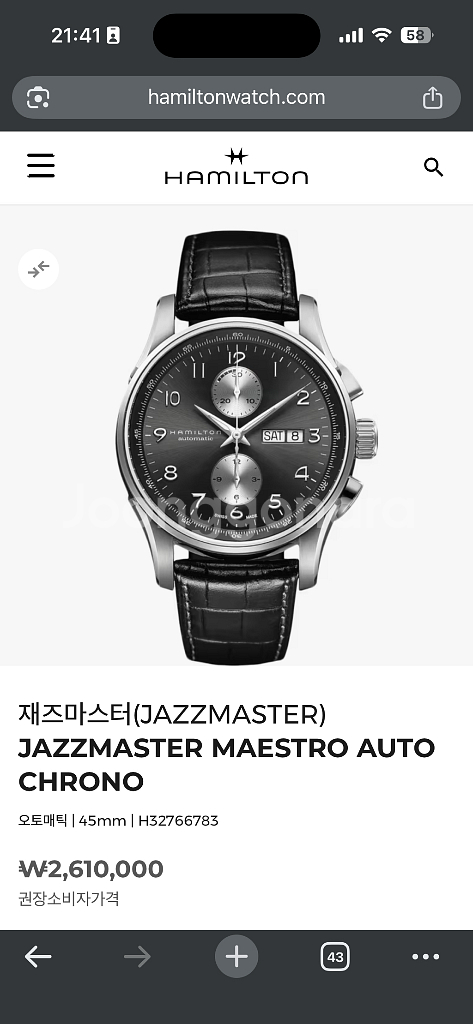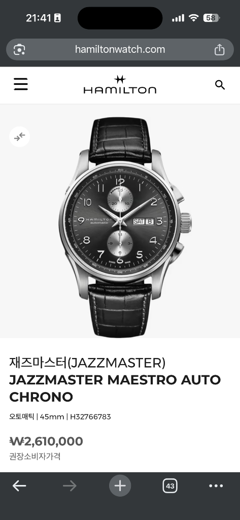 오토 크로노 시계 판매합니다 iwc의 포루투기저를 닮은 해밀뚜기 맞습니다 모델 번호는 H32766783입니다 - 45mm 사이즈 - H-21 오토매틱 무브먼트 클래식한 디자인으로 어떤 스타일에도 잘 어울립니다 데일리 시계로 착용하기 좋습니다 17년도에 유럽여행가서 구매하였습니다. 분기에 한두번정도 착용하였었습니다 오버홀 기간이 다가오는데 오버홀 할 여력은없어서 싸게 내놓으려고 합니다 - 박스는 없고 워런티 카드와 본품만 있습니다 - 생활기스가 존재하니 감안하여 구매부탁드립니다 (요청주시면 원하시는 부위 자세히 찍어 드릴께요) - 정품 스트랩은 판매하지 않습니다(판매할 컨디션이 아니라서요ㅠ 일단 같이 드리기는 할게요) 여의나루역 또는 개봉역 직거래합니다 택배거래는 파손 면책 및 환불 불가 조건으로 가능해요