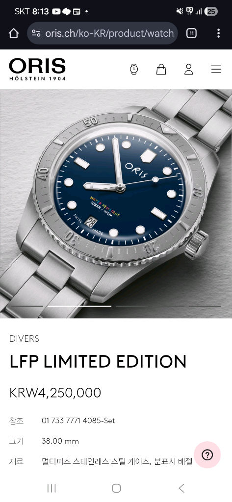 안녕하세요 오리스 식스티파이브 lfp 한정판 38mm 모델 판매합니다 25년 6월 롯데 스탬핑이며 한정판답게 영롱한 에나멜 다이얼 느낌의 깊은 청판 다이얼이 매력적인 제품입니다 풀세트 구성이며 브레이슬릿에는 생활 기스 다소 있지만 시계 헤드 부분에는 헤어기스도 찾아보기 힘든 컨디션입니다 구매 후 브레이슬릿만 소프트 폴리싱 진행하시면 새제품 컨디션으로 착용 가능하십니다 국내 재고 현재 없는걸로 알고있으며 리테일가 50프로 감가된 금액으로 판매합니다 직거래 역삼,방배,수지 가능하며 택배거래시 우체국택배로 보내드립니다 먼저 문자로 연락 부탁드립니다 감사합니다.