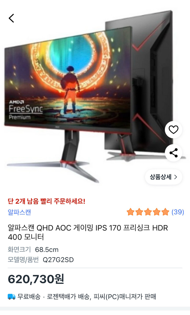 • 알파스캔 QHD 모델 모니터 산지 대략 1년 조금 넘은것 같습니다 구매당시 50만원 정도에 샀던것 같습니다 ! 모니터 좋은거 아시는분들은 아실꺼에요 유튜브에 쳐보셔도 됩니당 지금은 단종된 제품 이여서 구하지 못하는모델인데 가성비도 좋고 엄청 선명합니다 !! 박스는 없지만 정말 깨끗합니당 모니터가 저한테는 조금 큰 감이 있어서 판매 하려고 합니다 : )