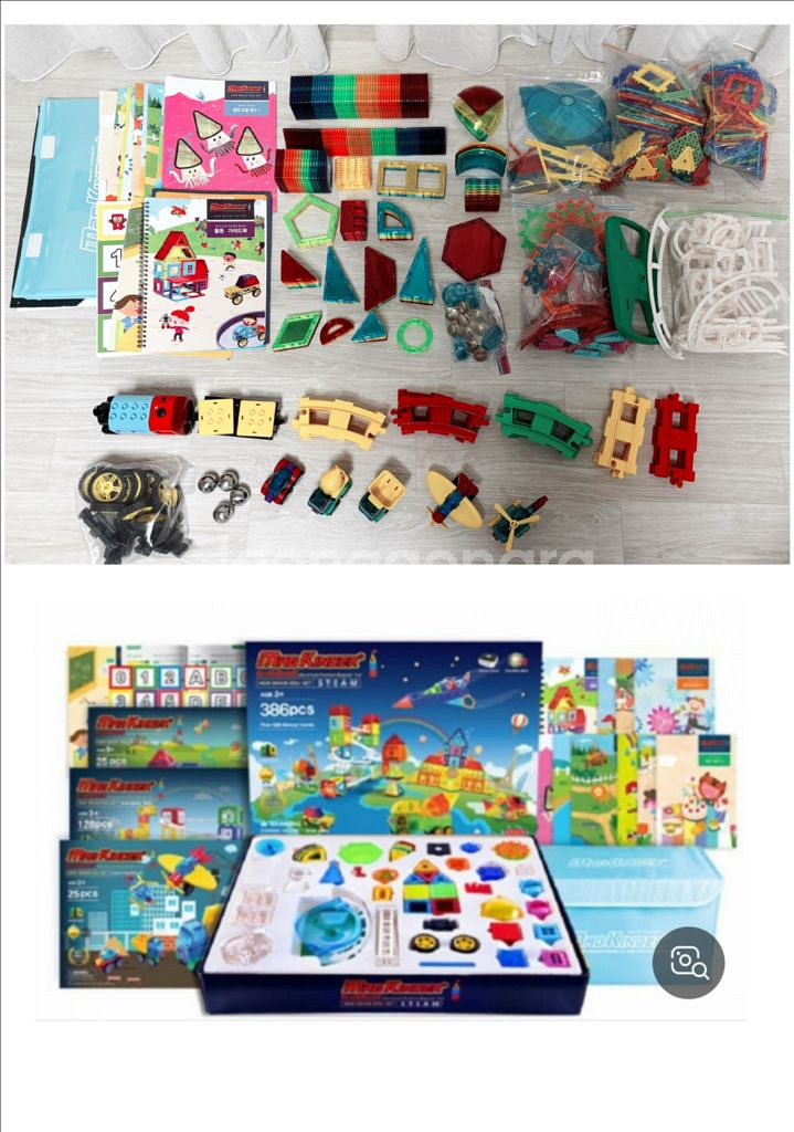 특별구성 제품) 맥킨더 자석블럭 +올마이티 블럭 30만원대 풀구성 쭉 보관만한 새상품급 제품입니다. 물건 선물 받고 상자에 다 쏟아 부어서 보관 쭉 했던 제품이고 이번에 올리려고 다시 꺼내서 분류해넣어놨어요. 구성품 비교해 보니 2조각이 비고 오히려 다른 조각은 많아요. 구입 후 보관만한 제품이라 새상품 그대로 드리는 겁니다. 구입 당시 홈쇼핑에서 풀 구성으로 30만원 넘게 주고 사주셨던건데 선물 받은 인증 사진 찍으려고 몇 조각만 좀 만져보고 쭉 보관만 했었어요. 블럭 및 책자, 보관함 등 구입 당시 풀구성 입니다. 자석블럭, 올마이티블럭 등 여러가지고 일반 자석 블럭과 다르게 비행기, 트럭, 기차, 놀이동산 등 여러가지로 만들 수 있는 모든 특별한 부품이 들어있는 특별한 구성으로 만들어진 풀세트 상품입니다. 초등 고학년 도형 파트에도 많이 도움됩니다. 다음주 이사로 이번주 빠른 거래 원해요.
