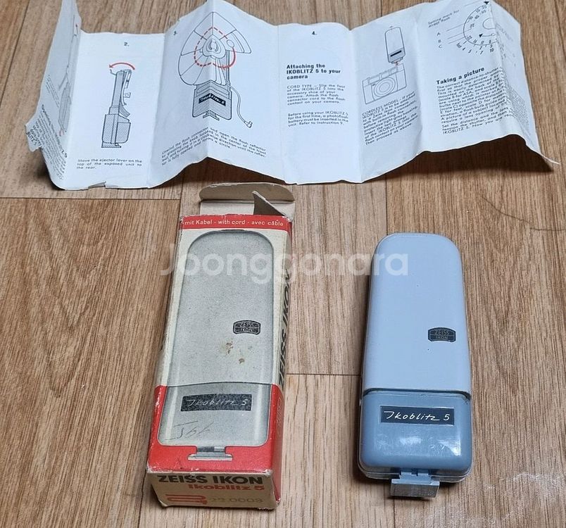 미사용 박스품 Zeiss Ikon의 Ikoblitz 5 플래시 빈티지 제품으로 박스와 플래시 작동 방식에 대한 설명이 담긴 설명서가 포함