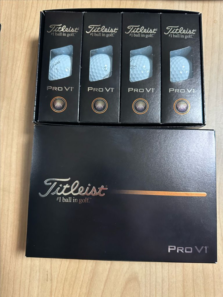 미사용 타이틀리스트 Pro V1 골프공 한 더즌 판매합니다. 아쿠쉬네트 정품이고, 12개 모두 새 볼입니다. 남는 3피스 작은박스들로 짜깁기한 한박스가 아니고 4인 동반 라운딩용으로 나온 박스제품으로 박스별로 숫자 1,2,3,4 새겨진 볼3개씩 들어있습니다