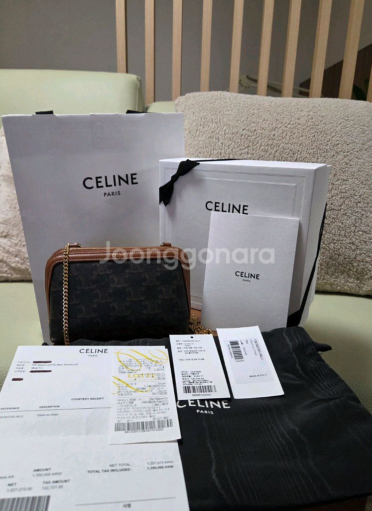 25년 롯데백화점에서 구입한 셀린느 체인 클러치입니다 ~ 시착 수준이라 사용감이 진짜 없다봐도 무방합니다. 각무너짐, 스크래치, 까임, 오염 없이 상태 정말 좋아 요. 생각보다 수납 공간이 넓어 쿠션, 립, 차키나 이어폰 핸드폰까지 모두 수납 잘 됩니다! ⭐️ 인보이스 + 백화점 영수증 + 택 + 더스트백 + 박스 + 쇼핑백 + 포장 리본 풀구성 그대로 다 있습니다. 네고 ✖️✖️