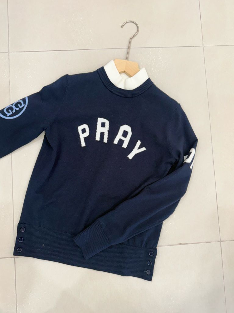지포어 방풍 모크넥 스웨터 네이비 색상입니다 앞면에는 'PRAY FOR' 문구가, 뒷면에는 'BIRDIES' 문구가 새겨져 있어 필드에서 개성을 표현하기 좋아요 소매와 밑단에는 지포어 로고와 버튼 디테일이 있어 세련된 느낌을 줍니다 안감은 해골 패턴으로 되어 있어 지포어만의 유니크한 디자인을 느낄 수 있습니다 방풍 기능이 있어 바람이 부는 날씨에도 따뜻하게 착용할 수 있으며, 보온성이 우수하여 쌀쌀한 날씨에 골프웨어로 활용하기 좋습니다 사이즈 M