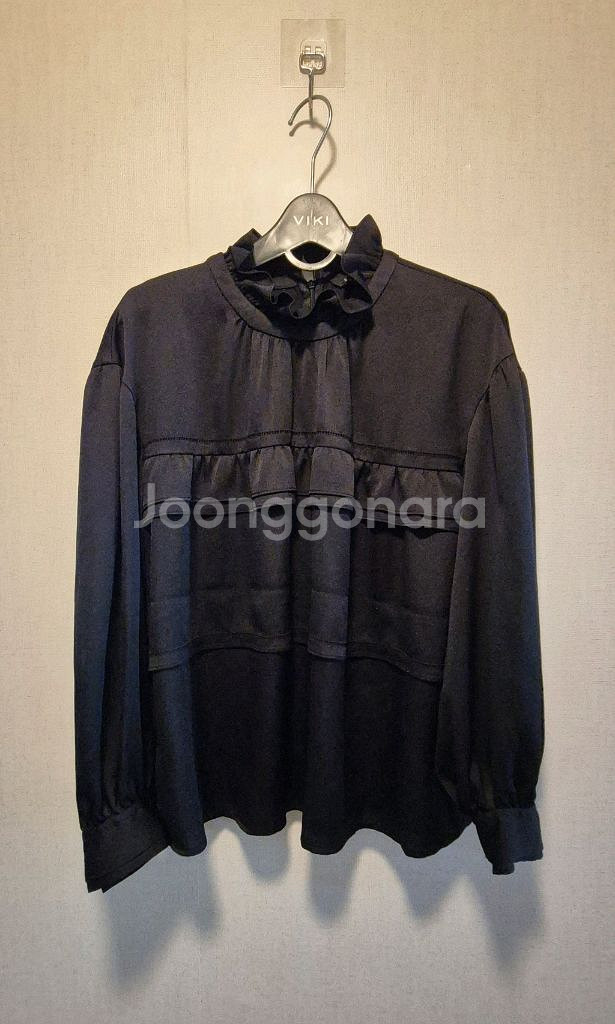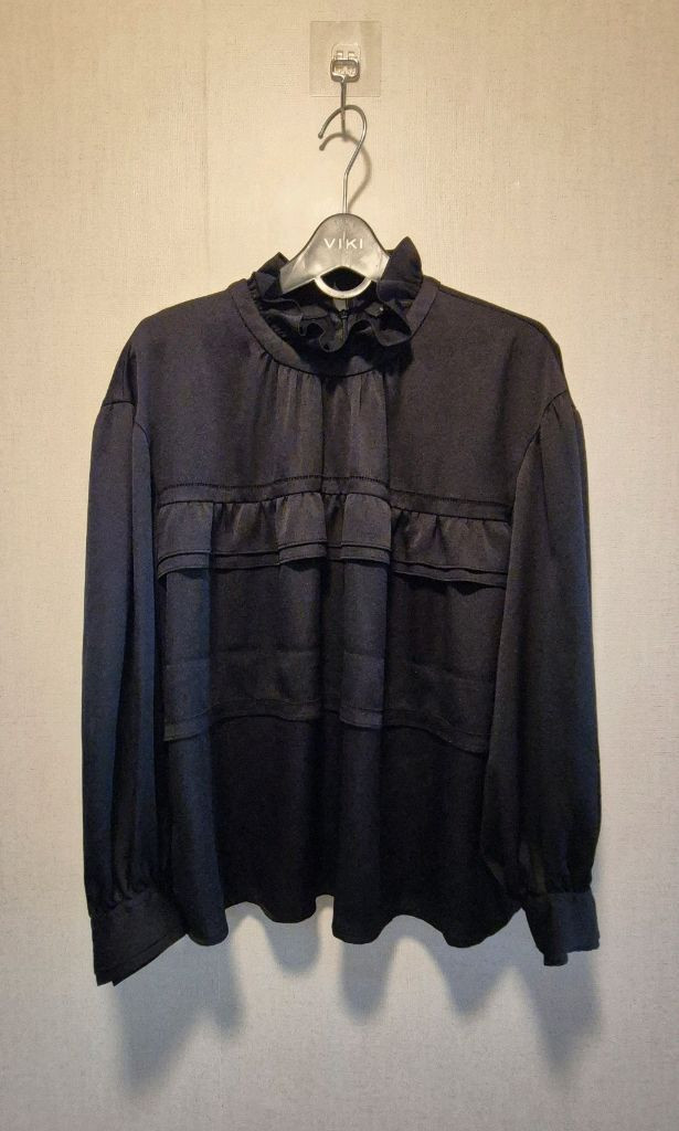 레니본 사랑스런 블랙 블라우스입니다 프릴넥이 포인트로 들어가 있고 가슴쪽 2단 프릴이 여성스러움을 더했습니다 실측싸이즈 가슴반품 47 총길이 62