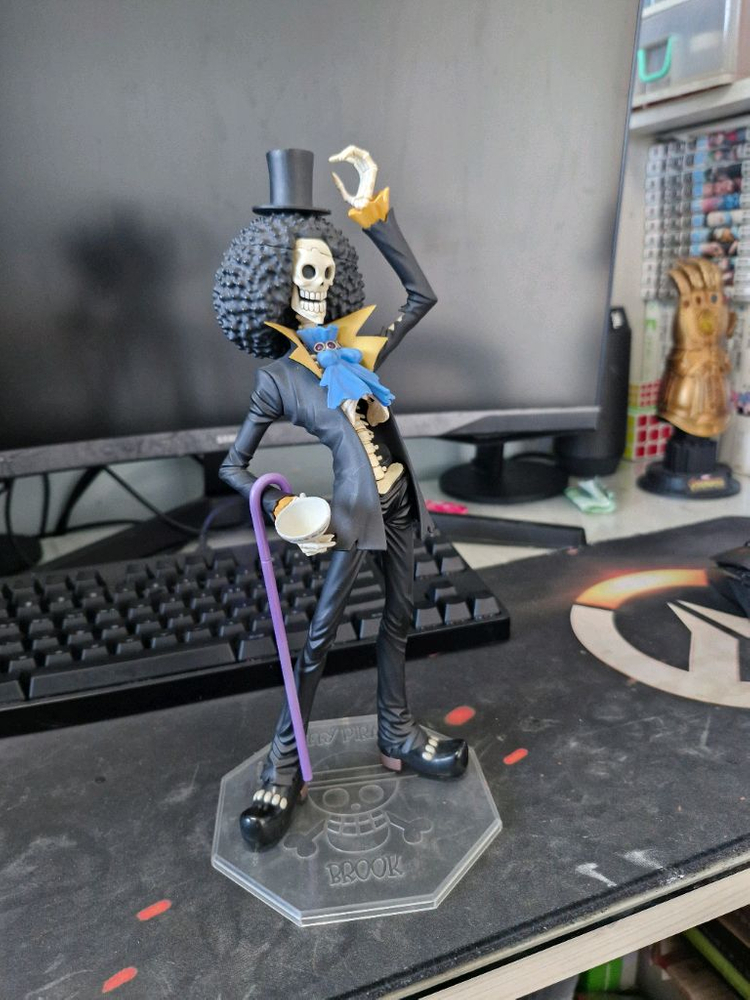 원피스 pop 메가하우스 브룩 피규어입니다. 정품이며, 박스는 없고 하자는 소라게 파츠없고 두번째 사진 오른속 파손되서 본드로 손접해놨고 그리고 세번째사진 균열 같은거 가있고 네번째 사진 뼈부분이 살짝 떠서 순접해놨습니다 바지쪽에 살짝 본드잘국 있고 그밑에 살짝 도색이 벗겨졌어요 그외에는 하자 없고 중고품이기 때문에 미처 확인하지 못한 부분이 있을 수 있는점 유의하시고 구매해주시면 감사하겠습니다 (배송중 파손은 책임지지 않고 파손면책 동의하셔야 택배 발송합니