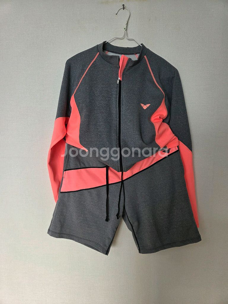 레쉬가드 상하의 세트 77사이즈입니다. 66,77까지 적당할듯합니다. 핑크색과 차콜그레이 색상으로 디자인되어있어 여성스러우면서 깔끔합니다. UV차단 97%입니다. 작아서 입지않은 새옷입니다.