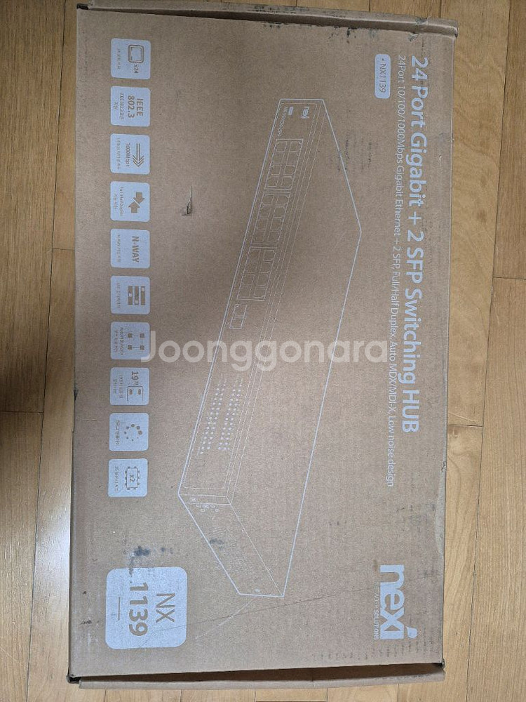 nexi 24포트 기가비트 + 2SFP 스위칭허브입니다. 박스 포장 상태로 새 제품이며, 전원 케이블과 구성품이 모두 포함되어 있어요. 박스는 깨끗하진않지만 새상품입니다~ 택배비는 제가 부담할께요~