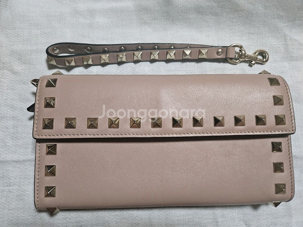 # 제품 상세 정보 -제품명: 발렌티노 가라바니 락스터드 엔벨로프 파우치 / 클러치 백 (Valentino Garavani Rockstud Calfskin Pouch with Wristlet) -특징: * 발렌티노의 상징인 플래티넘 마감 스터드가 테두리에 장식되어 있습니다. 탈부착 가능한 손목 스트랩(리스트릿)이 포함된 모델입니다. 내부에 카드 슬롯과 지퍼 수납공간이 있어 지갑 겸용 클러치로 인기가 많습니다. -소재: 부드러운 카프스킨(송아지 가죽) -색상: 파우더(Poudre) 또는 로즈 캐시미어 계열의 베이지 핑크 톤입니다. -단품입니다.