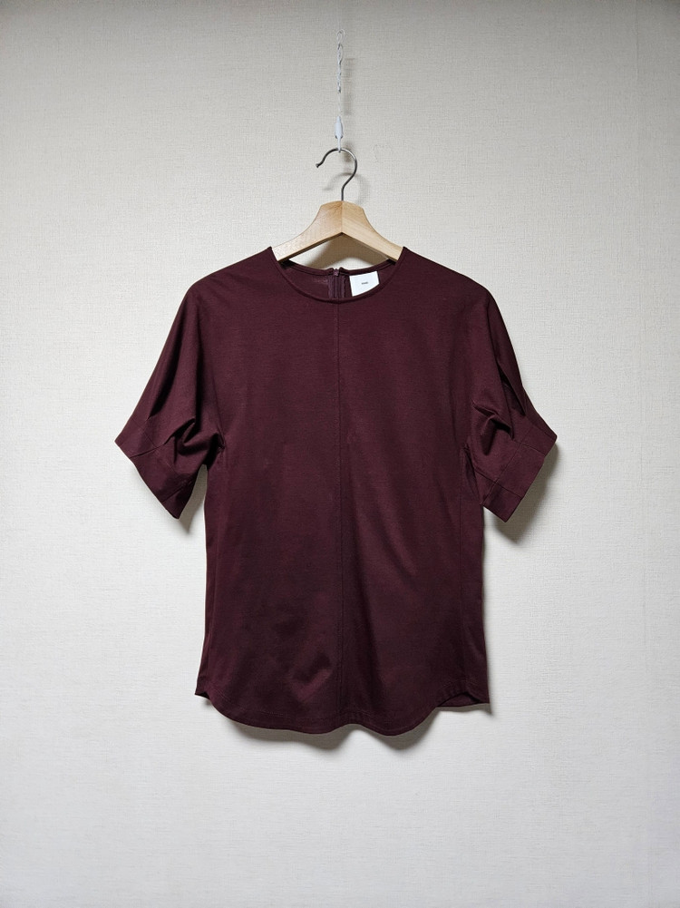 구호 KUHO 소매셔링 티셔츠 S사이즈 버건디 컬러의 얇은 면소재로 여름에 적당 볼륨소매쪽 주름디테일, 등 지퍼 여밈 자연스러운 생활사용감 정도이며 눈에 띌만한 큰 하자 오염은 없는 양호한 컨디션이에요 . 사이즈 가슴단면 44 기장 64 S사이즈로 55정도입니다 통통 55분은 x