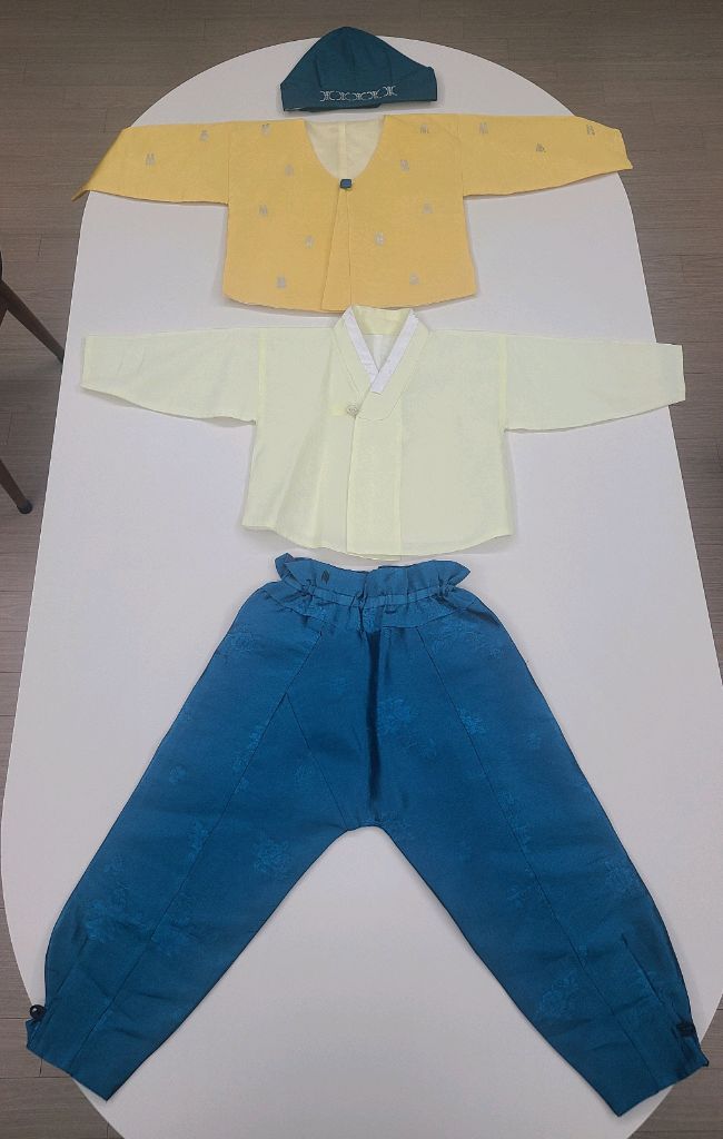 남아 한복 + 복건 세트입니다. 유치원행사(생일포함)와 명절때 유용하게 입히고 작아져서 판매합니다. - 사이즈는 5호(크게 6세~ 딱 맞게1초까지 입혔습니다) - 바지쪽에 얼룩 있어요(사진 참고) 교환,환불,예민하신분,잠수타실분, 매너없이거래하실분은 패스할게요!!