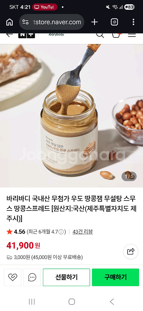 100% 우도 땅콩 버터예요. 제주에서 직접 생산된 신선한 제품으로 건강한 식품으로 좋습니다. 바라바디 국산 무첨가 100% 우도 땅콩잼입니다 스무스 땅콩버터 스프레드이고, 원산지는 국산(제주특별자치도 제주시)입니다 2026.4.3유기임박으로 급처합니다