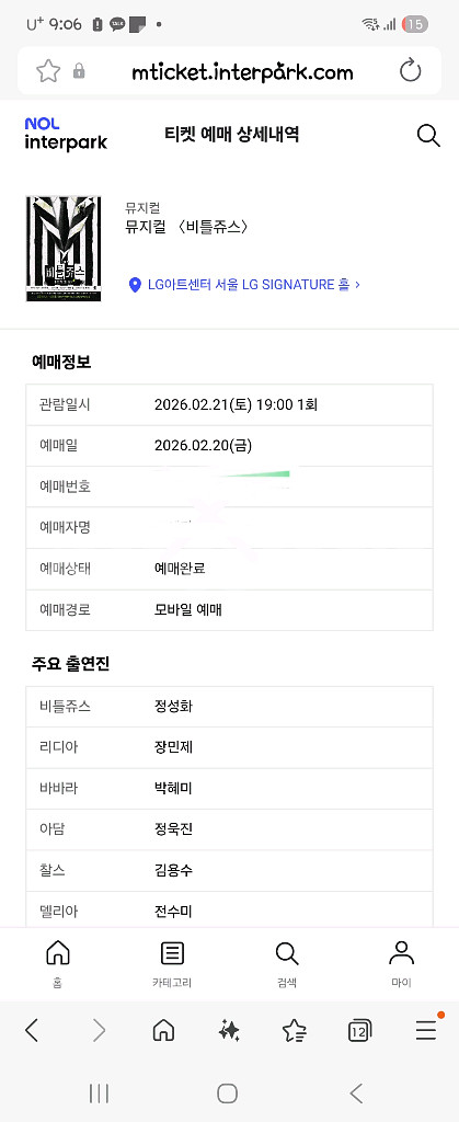 2월 21일 뮤지컬 VIP석 티켓이에요. 좌석 위치 확인 가능하고 상태 양호합니다. 함께 관람하실 분께 양도해요! 안심 결제 하시면 핸드폰 번호랑 예매 번호 바로 보내드립니다.