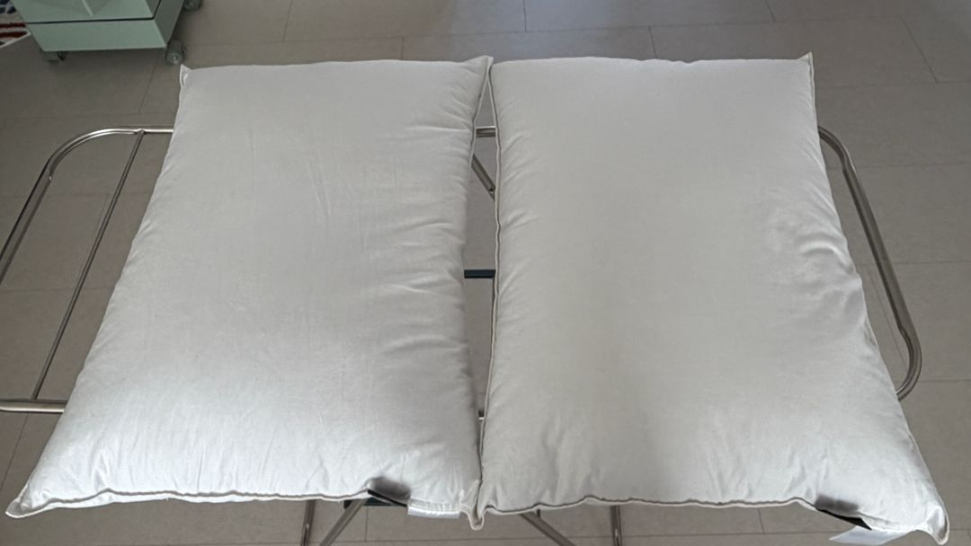 구스앤홈 프렌치덕 베개 2개입니다 사이즈는 50x70이고 색상은 화이트, 700g입니다. 작년 말에 큰 맘 먹고 개당 17만원 정도로 샀는데 구스는 저희한테 안 맞아서 팔아요.. 실사용 별로 안해서 상태 좋습니다. 네고 어느 정도 고려중이니 편하게 연락주세요!
