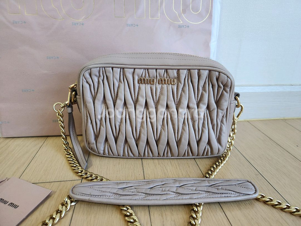 미우미우 마테라쎄 가방입니다. 정품 맞고 사진에 보이는 구성 다 드립니다. * 구성 : 쇼핑백, 품질보증서. RFID카드 등 새상품이 아니라 세월의흔적 있으나 특별한 하자는 없고 가방 안 도 깨끗합니다. 밟은 색상임에도 불구하고 이정도 상태면 관리 굉장히 잘 되었다고 생각됩니다만 예민하신분은 새상품 구매해주세요~ - 사이즈 : 20 x 13 x 5.5 (cm)