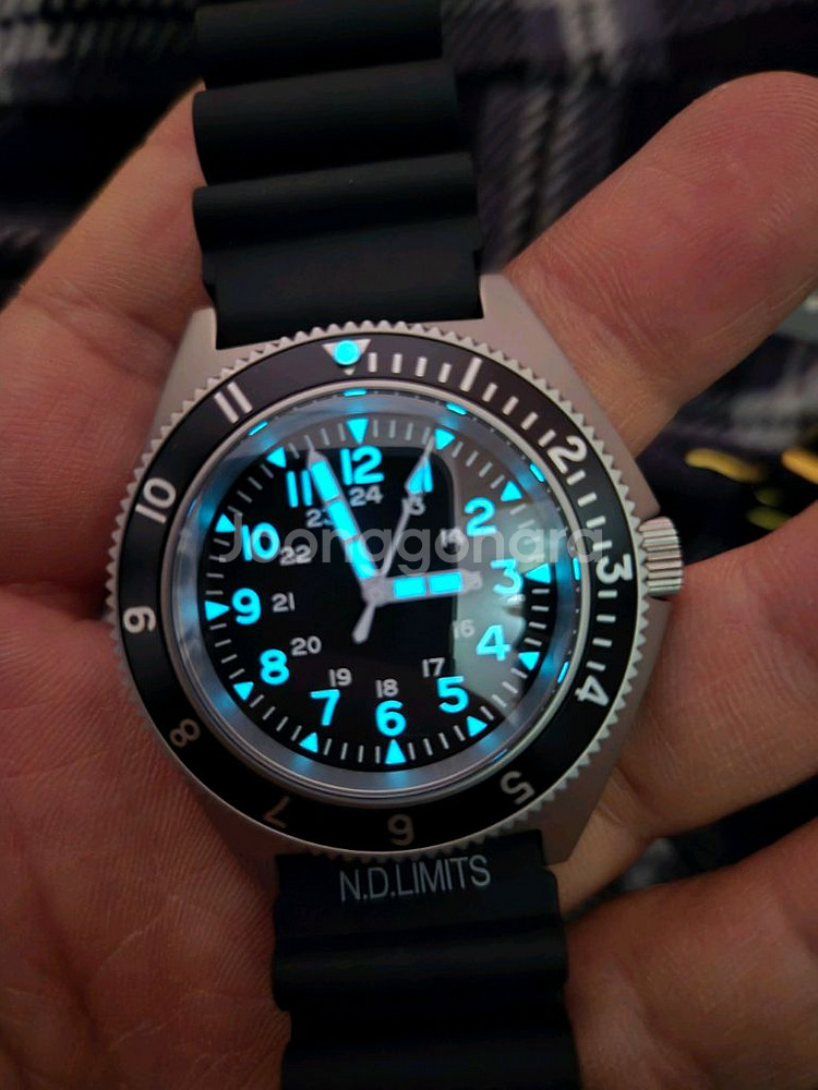 오토매틱처럼 흐르는 일본 vh31 쿼츠 무브먼트 만듬새가 아주 좋은 밀리터리 워치 사파이어 글라스로 기스 안남 120클릭의 촘촘한 단방향 회전 베젤 (단차없이 견고하고 정확한 베젤) 11시 방향 베젤 작은 상처 있습니다. 상처가 날 수록 멋있는 빈티지스러운 디자인 마크없는 깔끔한 다이얼과 야광 성능이 좋은 너무 멋진 인덱스 더 어두운 곳에서 보면 파란색 야광이 아주 훌륭하고 이쁩니다. 기존 밴드는 나토밴드인데 안 어울려서 없애고 가지고 있던 통가죽 밴드로 교체된 상태입니다. 밴드도 1회 착용하여 새거나 다름이 없네요. 두께에 비해 가죽이 부드럽고 유연합니다. 하드케이스 보관함 포함 풀박스입니다.