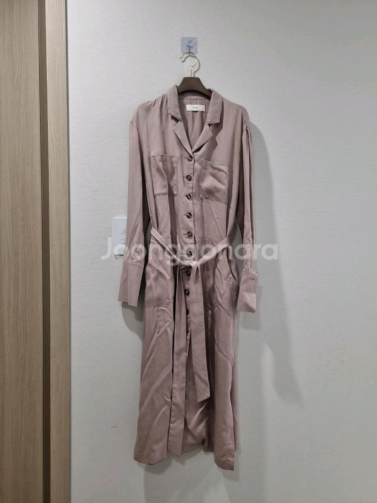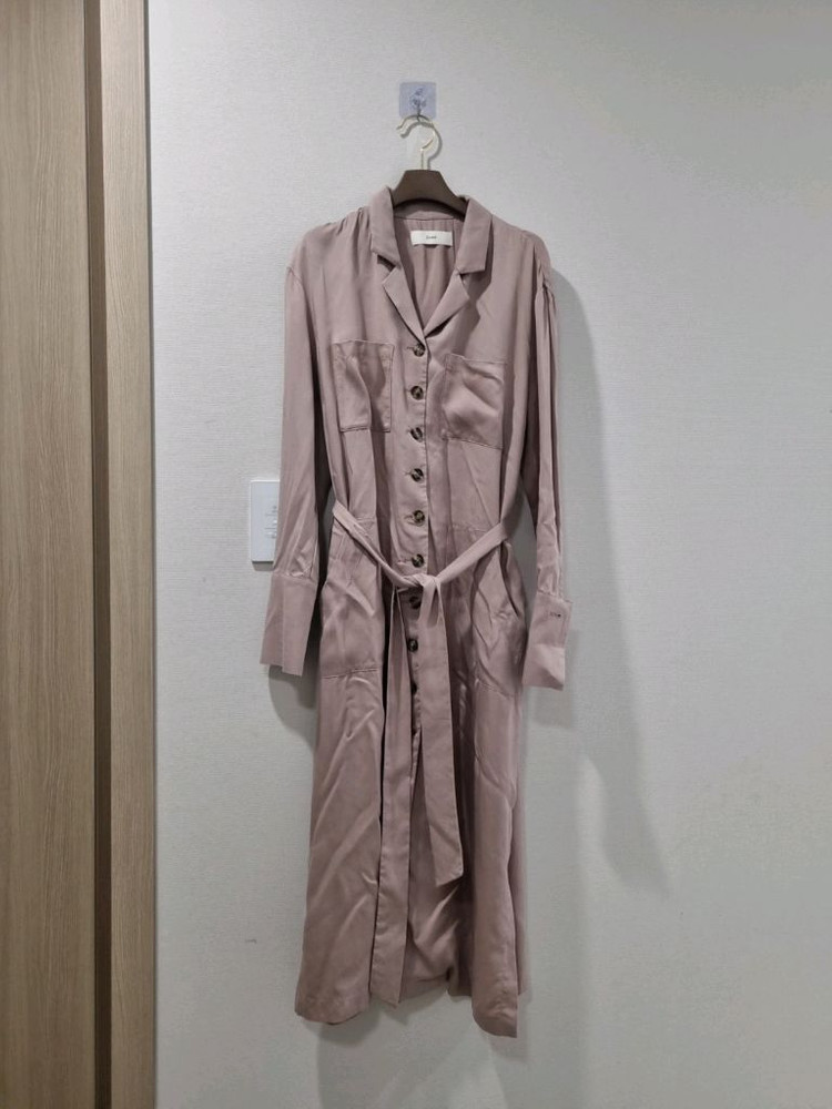 은은한 광택이 도는 던스트 롱 셔츠 원피스입니다. 허리 스트랩으로 연출이 가능하고, 오픈해서 가운처럼 걸쳐도 예뻐요. 데이트룩이나 하객룩으로도 활용하기 좋은 디자인입니다. 사이즈 S 가단49 총장121 상태깨끗해요.