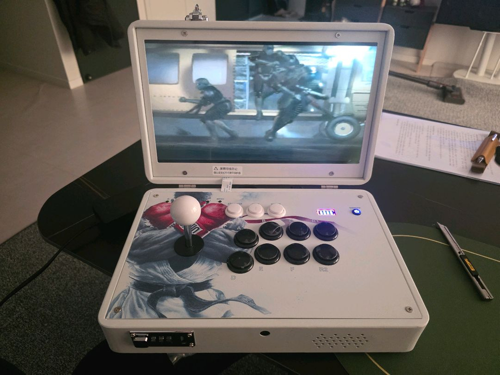 휴대용 레트로 게임기입니다 가방형 케이스로 되어있어 휴대하기 편리합니다 철권 게임이 실행되고 있는 화면입니다 버튼과 조이스틱으로 게임을 즐길 수 있습니다 휴대용 가방이 포함되어 있습니다 거의 사용 안함 새거나 다름 없어요 집 정리하다 사용안해서 팔아요 택포 입니다.