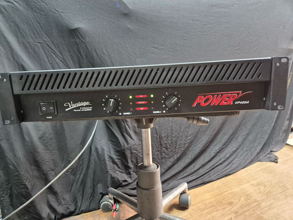 Vantage VP400A 2채널 파워 앰프입니다 내구성이 뛰어난 2채널 파워 앰프로, 스테레오 모드에서 4옴 기준 채널당 200W+200W (8옴 시 120W+120W), 브리지 모드 시 400W(8옴) 출력을 제공합 니다. 안정적인 출력과 견고한 구조가 특징인 범용 파워 앰프입니다. 전원 케이블 포함입니다 생활 스크래치 존재합니다