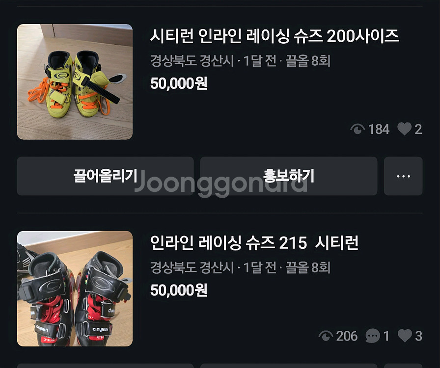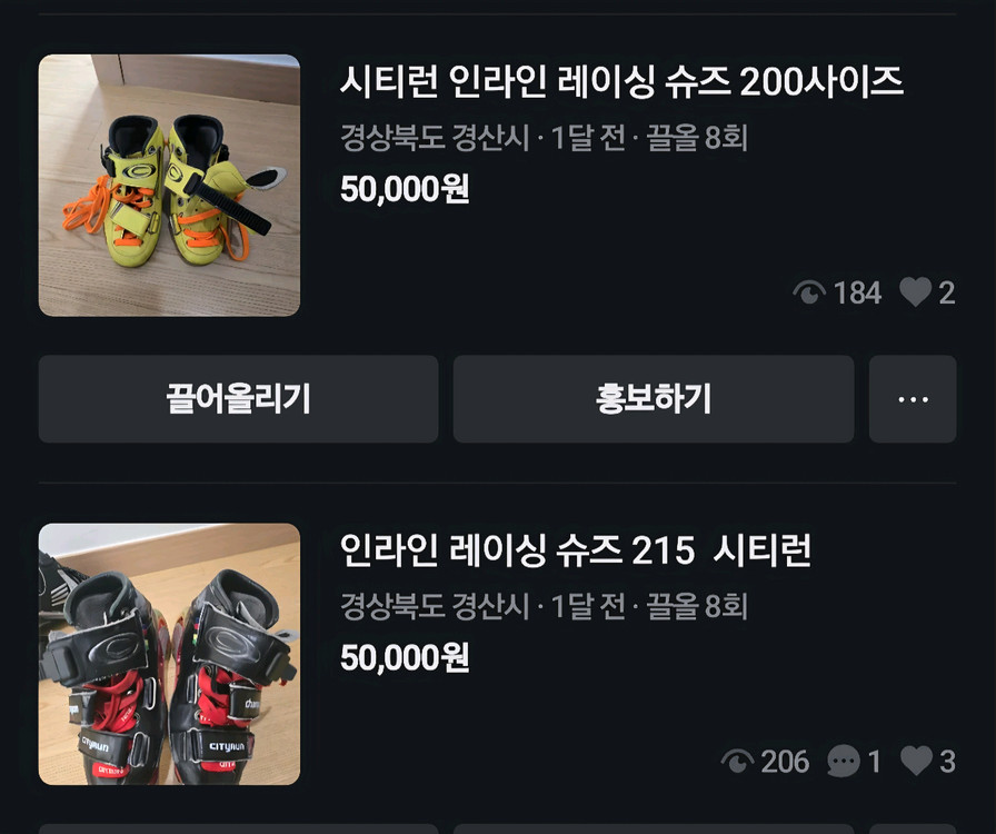 인라인 레이싱용 슈즈예요. 200 및 215사이즈로 상태 양호하고 실사용감 있지만 아직 충분히 신을 수 있어요. 각 5만