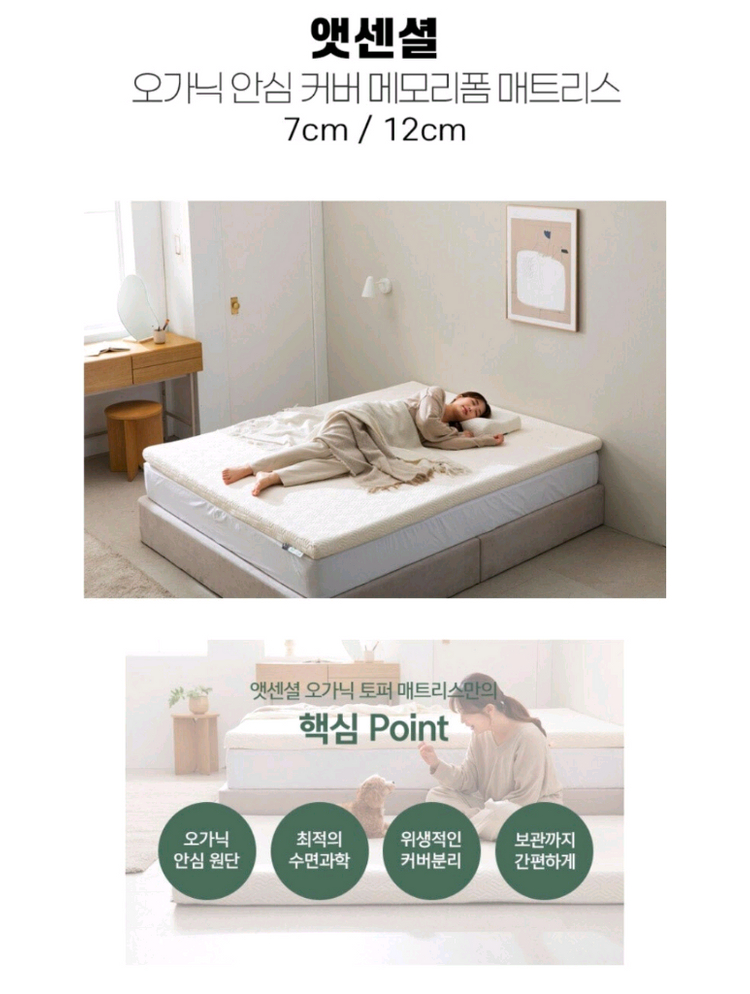 배송 박스에서만 꺼내놓고 배송받은 그대로 압축 밀봉 상태로 옷장속에 보관중인 새제품 입니다. 앳센셜 오가닉 안심 커버 메모리폼 매트리스 토퍼 슈퍼싱글 SS 사이즈이며 두께는 7cm 짜리입니다. - 오가닉 안심 원단을 사용하여 안심하고 사용할 수 있습니다 - 44KG/M2 밀도의 메모리폼으로 최적의 수면 환경을 제공합니다 - 위생적인 커버 분리가 가능하여 세탁이 용이합니다 - 압축 포장 기술로 간편하게 배송 및 보관이 가능합니다 - 구성품: 토퍼 매트리스 & 커버 & 결합벨트 & 보관백 & 방수커버
