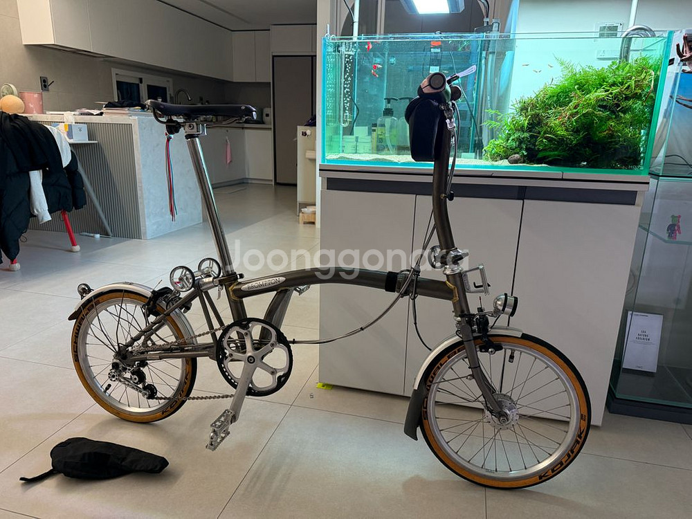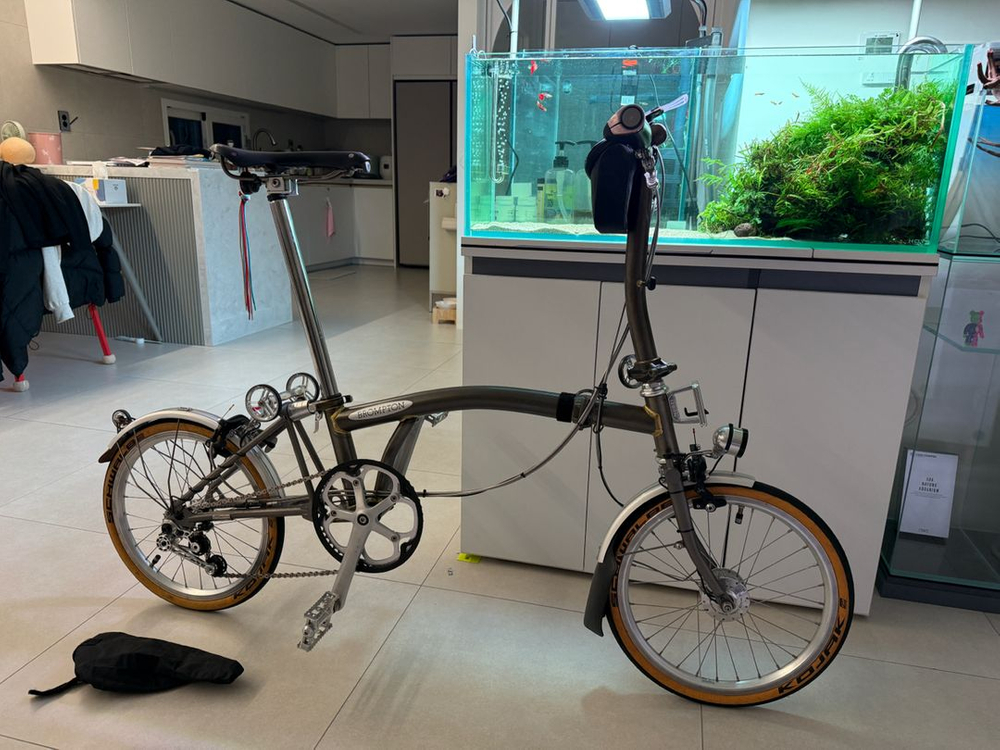 브롬톤 로우락카 외장 3단 티탄 풀튜닝 14년식 프레임에 튜닝 후 전시만한 제품 입니다 실주행 거의 없다고 보셔도 됩니다. 브룩스 스왈로우 티탄 레일 브룩스 그립 에델룩스2 라이트 및 Son 리어램프 손 클래식 허브 다이나모 휠셋 H&H 싯클램프셋 H&H 이지휠셋 및 리디아 업 H&H 싯포스트 클램프 세트 리디아 초경량 브레이크셋 노브디자인 텐셔너 TI-Part 기어셋 티탄레일 앞/뒤 머드가드 및 리디아 이지휠 MKS 착탈식 이름긴페달 대략 튜닝내용은 이렇고 상태 좋습니다 직거래 수원입니다.