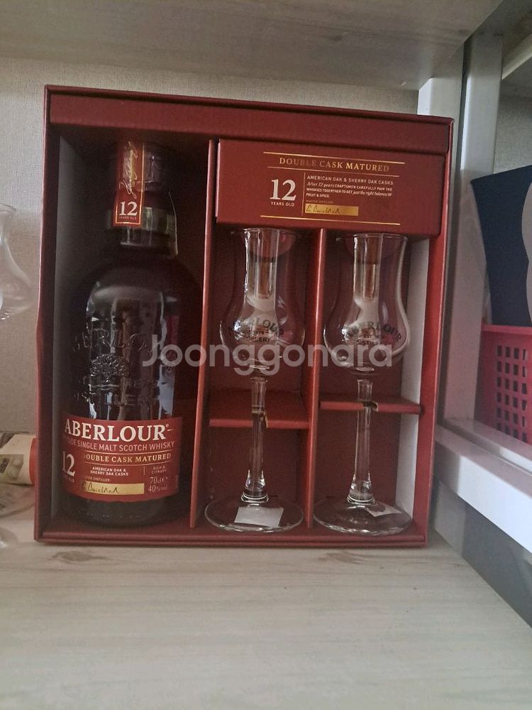 12년 술럼 와인잔과 병이 포함된 세트예요. 고급스러운 브라운 박스에 깔끔하게 포장되어 있어서 선물용으로도 좋을 것 같아요. 상태는 양호한 편입니다.