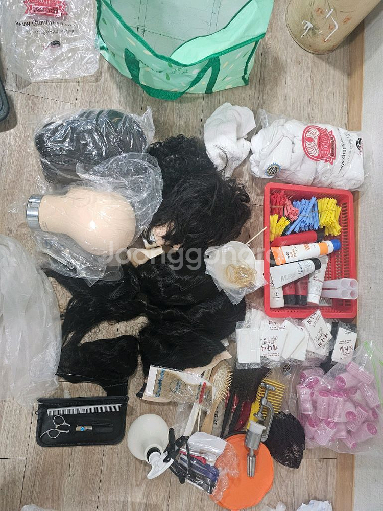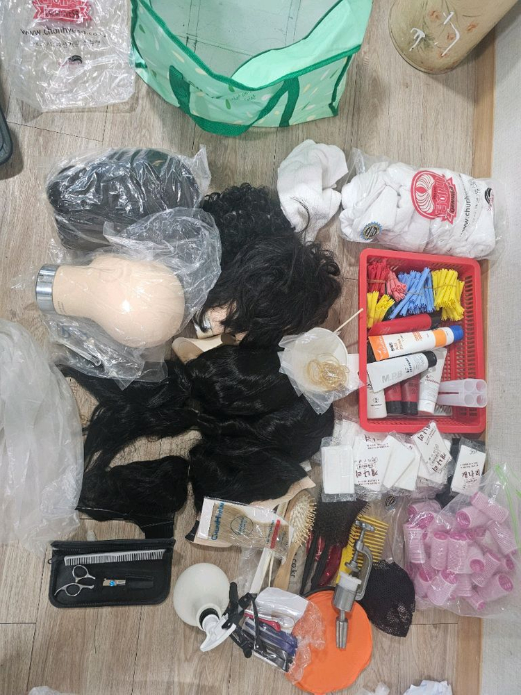 미용 헤어 실기 준비물 일괄 판매합니다 다양한 가발과 롤, 빗, 염색약 등 미용사 자격증 실기 준비에 필요한 모든 구성품이 포함되어 있어요 특히 덧가발총4개 3개 새것 1개 펌연습가능 마네킹가발붙은가발2개 가발도 있어 실습에 유용하게 사용하실 수 있습니다 사진에 보이는 모든 구성품 그대로 드립니다 염색약2세트 수건넉넉함 파마지아주많음 스프레이만손잡이부분깨져서 따로셤때하나구입하셔요