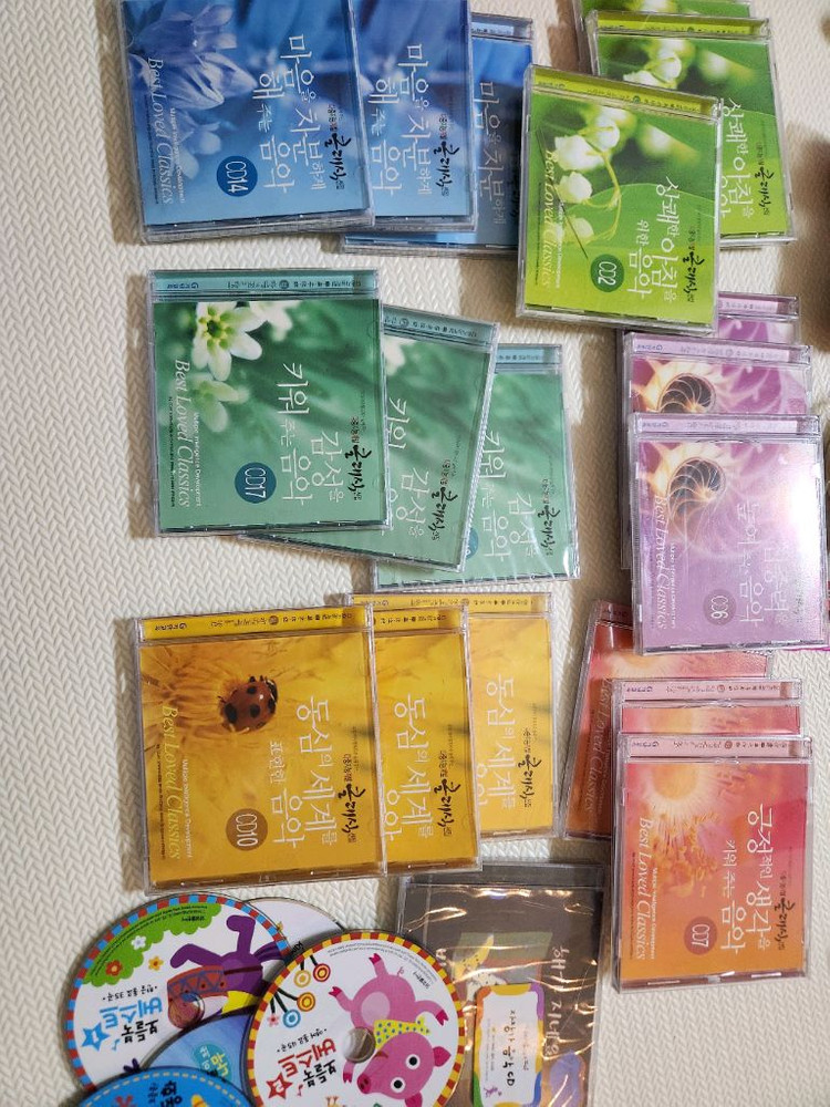 다양한 장르의 음악 CD들이 포함된 대용량 세트예요. 아이들 교육용이나 개인 소장용으로 좋을 것 같아요. 케이스가 깨진것도 있고 새거 비닐도 안뜯은 것도 있어요 아이들이 좋아하는 다른 동요랑 자장가 cd도 여러장 같이 드려요